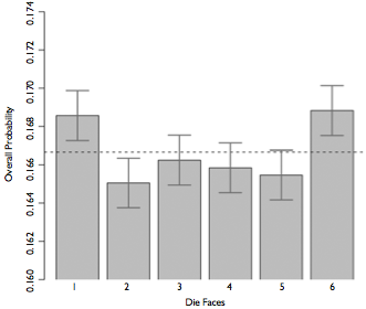 class: center, middle, inverse, title-slide # Inference for Categorical Data ## DATA 606 - Statistics & Probability for Data Analytics ### Jason Bryer, Ph.D. and Angela Lui, Ph.D. ### March 23, 2026 --- # One Minute Paper Results .pull-left[ **What was the most important thing you learned during this class?** <img src="06-Inference_for_Categorical_Data_files/figure-html/unnamed-chunk-2-1.png" alt="" style="display: block; margin: auto;" /> ] .pull-right[ **What important question remains unanswered for you?** <img src="06-Inference_for_Categorical_Data_files/figure-html/unnamed-chunk-3-1.png" alt="" style="display: block; margin: auto;" /> ] --- # Example Two scientists want to know if a certain drug is effective against high blood pressure. The first scientist wants to give the drug to 1,000 people with high blood pressure and see how many of them experience lower blood pressure levels. The second scientist wants to give the drug to 500 people with high blood pressure, and not give the drug to another 500 people with high blood pressure, and see how many in both groups experience lower blood pressure levels. Which is the better way to test this drug? >- **500 get the drug, 500 don't** --- # Survey of Americans The GSS asks the same question, below is the distribution of responses from the 2010 survey: Response | n ---------------------------|------ All 1000 get the drug | 99 500 get the drug 500 don't | 571 **Total** | **670** --- # Parameter of Interest * Parameter of interest: Proportion of *all* Americans who have good intuition about experimental design. `$$p(population\; proportion)$$` * Point estimate: Proportion of *sampled* Americans who have good intuition about experimental design. `$$\hat{p}(sample\; proportion)$$` --- # Inference for a proportion What percent of all Americans have good intuition about experimental design (i.e. would answer "500 get the drug 500 don't?" * Using a confidence interval `$$point\; estimate \pm ME$$` * We know that ME = critical value x standard error of the point estimate. `$$SE_{\hat{p}} = \sqrt{\frac{p(1-p)}{n}}$$` --- # Central limit theoreom for proportions Sample proportions will be nearly normally distributed with mean equal to the population mean, *p*, and standard error equal to `\(\sqrt{\frac{p(1-p)}{n}}\)`. $$\hat { p } \sim N\left( mean=p,SE=\sqrt { \frac { p(1-p) }{ n } } \right) $$ This is true given the following conditions: * independent observations * at least 10 successes and 10 failures --- class: font80 # Simulating the CLT .pull-left[ Let's consider a population of 1,000,000 where the true proportion is 0.85. ``` r pop_prop <- 0.85 N <- 1000000 pop <- c(rep(0, N * (1 - pop_prop)), rep(1, N * pop_prop)) ``` We can estimate the sampling distribution by taking 1,000 random samples of size 30. ``` r n <- 670 samp_dist <- numeric(1000) for(i in 1:length(samp_dist)) { samp_dist[i] <- sample(pop, size = n) |> mean() } ``` Calculate the standard error using one sample. ``` r samp_se <- sqrt((0.85 * (1 - 0.85)) / 670) ``` ] .pull-right[ The figure represents the sampling distribution. The blue line is from the estimated sampling distribution. The green line is from the one sample (i.e using the SE formula). <img src="06-Inference_for_Categorical_Data_files/figure-html/unnamed-chunk-7-1.png" alt="" style="display: block; margin: auto;" /> ] --- # Back to the Survey * 571 out of 670 (85%) of Americans answered the question on experimental design correctly. * Estimate (using a 95% confidence interval) the proportion of all Americans who have good intuition about experimental design? Given: `\(n = 670\)`, `\(\hat{p} = 0.85\)`. Conditions: 1. Independence: The sample is random, and 670 < 10% of all Americans, therefore we can assume that one respondent's response is independent of another. 2. Success-failure: 571 people answered correctly (successes) and 99 answered incorrectly (failures), both are greater than 10. --- # Calculating Confidence Interval Given: `\(n = 670\)`, `\(\hat{p} = 0.85\)`. `$$0.85 \pm 1.96 \sqrt{\frac{0.85 \times 0.15}{670}} = \left(0.82,\; 0.88\right)$$` We are 95% confidence the true proportion of Americans that have a good intuition about experimental designs is betwee 82% and 88%. --- # How many should we sample? Suppose you want a 3% margin of error, how many people would you have to survey? Use `\(\hat{p} = 0.5\)` * If you don't know any better, 50-50 is a good guess * `\(\hat{p} = 0.5\)` gives the most conservative estimate - highest possible sample size `$$0.03 = 1.96 \times \sqrt{\frac{0.5 \times 0.5}{n}}$$` `$$0.03^2 = 1.96^2 \times \frac{0.5 \times 0.5}{n}$$` `$$n \approx 1,068$$` --- class: font90 # Choosing a sample size How many people should you sample in order to cut the margin of error of a 95% confidence interval down to 1%? `$$ME = z^* × SE$$` Using `\(\hat{p}\)` from previous slides. $$0.01 \ge 1.96 \times \sqrt{\frac{0.85 \times 0.15}{n}} $$ `$$0.01^2 \ge 1.96^2 \times \frac{0.85 \times 0.15}{n}$$` `$$n \ge \frac{1.96^2 \times 0.85 \times 0.15}{0.01^2}$$` `$$n \ge 4,898.04$$` *n* needs to be at least 4,899 to have a 1% margin of error. --- # Example: Two Proportions Scientists predict that global warming may have big effects on the polar regions within the next 100 years. One of the possible effects is that the northern ice cap may completely melt. Would this bother you a great deal, some, a little, or not at all if it actually happened? Response | GSS | Duke -------------|----:|-----: A great deal | 454 | 69 Some | 124 | 40 A little | 52 | 4 Not at all | 50 | 2 Total | 680 | 105 --- # Parameter and Point Estimate Parameter of interest: Difference between the proportions of *all* Duke students and *all* Americans who would be bothered a great deal by the northern ice cap completely melting. `$$p_{Duke} - p_{US}$$` Point estimate: Difference between the proportions of *sampled* Duke students and *sampled* Americans who would be bothered a great deal by the northern ice cap completely melting. `$$\